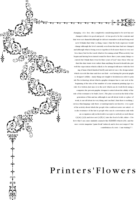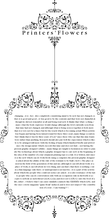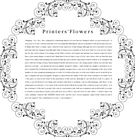 デザインは夢。作る人達が自由を得るために考えられた最後の砦のようなもの。でした。僕はグラフィックデザインをやってきました。この愛おしくて愛おしくて仕方のないグラフィックデザインを、どうすればそれが証明出来るのかを、ずっと考えてきました。既に終わったものを夢を見て、続けているだけなんですね。しかも大勢の人間が。だからこそ実証する事にその意識を集中しているし、夢を終わらせない為にも未来を見てデザインを施している。それは同時に曖昧な嘘でもあって、僕は長くその状態に疑問を持っていました。花形装飾活字に手を出したのも、其処から来ています。提案をするという事は、夢を見ると同義であって、昨今ではその意味合いさえも曖昧さが増しています。デザインが経済に与える影響は非常に大きいというのもあって、たくさんの人が、まだまだ現役の思想として関わっています。もしくは関わり始めています。本来見てはいけない夢なのに、同時に非常に危険な行為でもあって。ここらで覚めなくてはならないと思います。もうそろそろ、夢を見なくても心地よいグラフィックデザインが出来る時期に入っているし、デザインとは違う思想において、夢を見て作っていいタイミングに来ているようにも感じています。僕が次の夢を見る前に、夢にまで見たグラフィックデザインを此処に置いておきたいと思います。もちろん、叶うのだったら何時でも良いのです。まだ希望が残っているのだとすれば、夢を共有していただけるなら、その世界は広がるような気がしていますから。1つ、このデータを手にする上で条件があります。単に欲しいから使いたいからと言って手にしないでください。残念乍らあなたの夢に加担するつもりなんてさらさらありませんし、あなたのワガママを聞けるほどに僕の心は広くないのです。その無理を押してお使いになっても良いですが、ここまで高めたモノを使う事のリスクを、よく、お考えになってからにした方が身の為だと思います。デザインは夢。僕の見たデザインへの夢を叶えてくれる意志のある方にこそ、このデータを手にするにふさわしいと考えています。